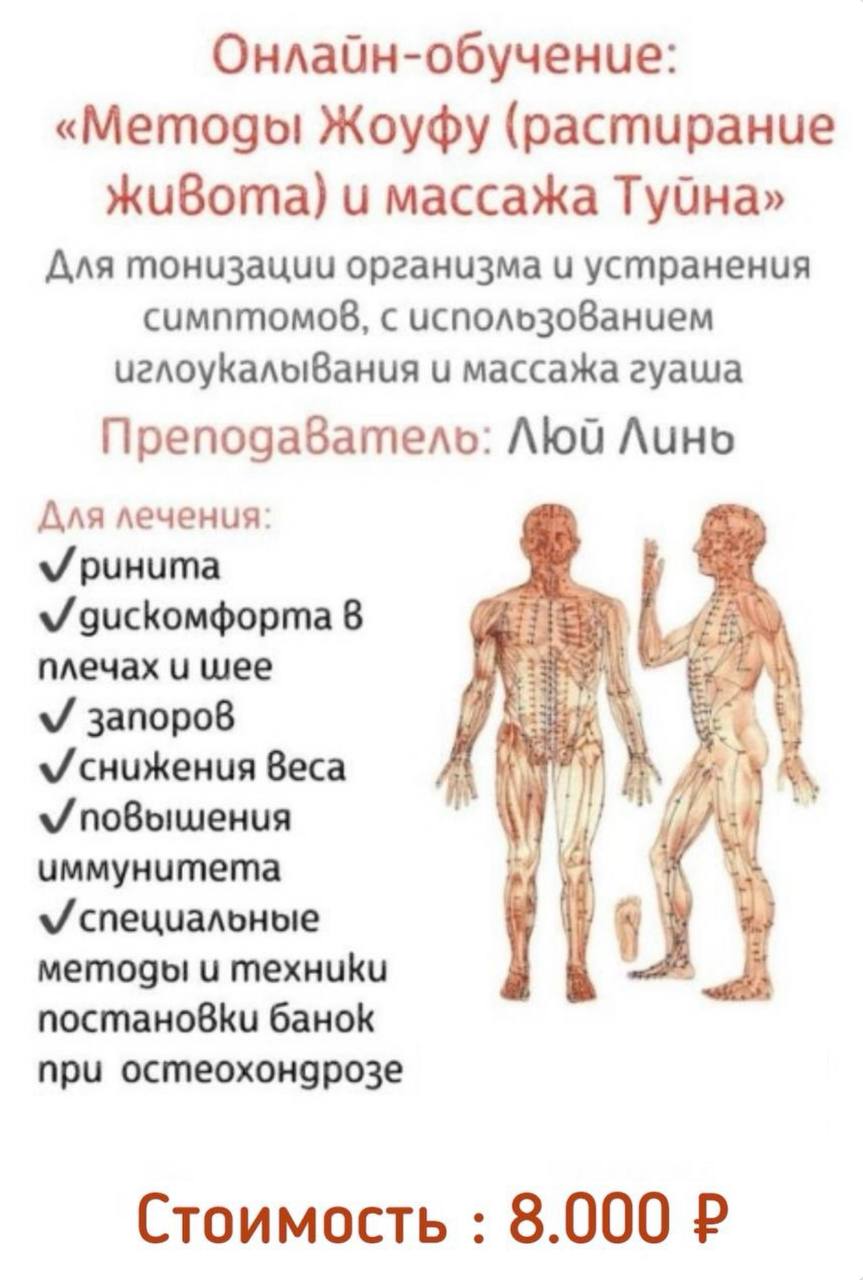 Методы Жоуфу (растирание живота) и массажа Туйна для тонизации организма и устранения симптомов, с использованием иглоукалывания и массажа гуаша для лечения ринита, дискомфорта в плечах и шее; лечение запоров и снижение веса, повышение иммунитета, специальные методы и техники постановки банок для лечения остеохондроза.
